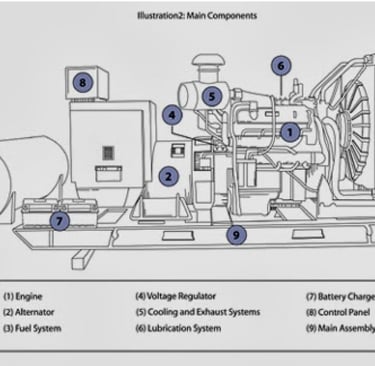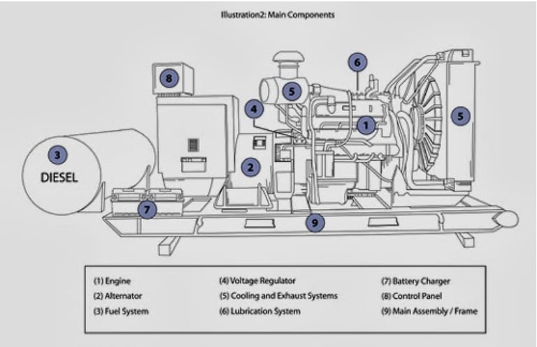 • Jeneratörün yakıt deposunun bulunacağı yer için gerekli tedbirler alınacaktır. Binalarda kullanılan jeneratörlere dönme hareketi genellikle benzin, mazot gibi fosil yakıtlarla çalışan motorlar yardımıyla kazandırılır. Bu yakıtlardan mazot maliyeti ucuz olduğu için günümüzde üretilen ev tipi jeneratörlerin çoğu mazotlu ya da dizel olarak tabir edilen cinstendir. Dizel motorun çalışması rotoru harekete geçirmekte, bu hareket rotora iletilmekte, rotor bulunduğu manyetik alan içerisinde hareket ederek elektrik enerjisi oluşmaktadır.